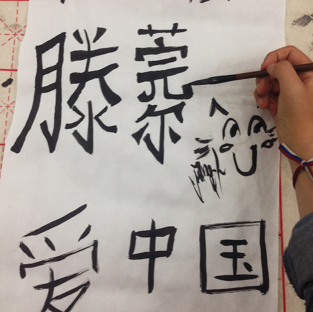 Вечером у нас был урок каллиграфии. В большом зале заседаний Хэйлунцзянского университета нам разложили листы для каллиграфии, чернила и кисточки. Мы-то думали, что мы сразу как придем будем что-нибудь писать. Нет же, мы слушали два часа надоедливого дедушку, который объяснял как правильно писать, показывал свою каллиграфию и рассказывал историю создания самой каллиграфии и все на китайском! При каждом подходящем случаи, как только дедушка замолкал, мы начинали хлопать и визжать, намекая на то, что нам очень все нравится, что он рассказывает и пора уже закругляться ему и начинать рисовать нам.